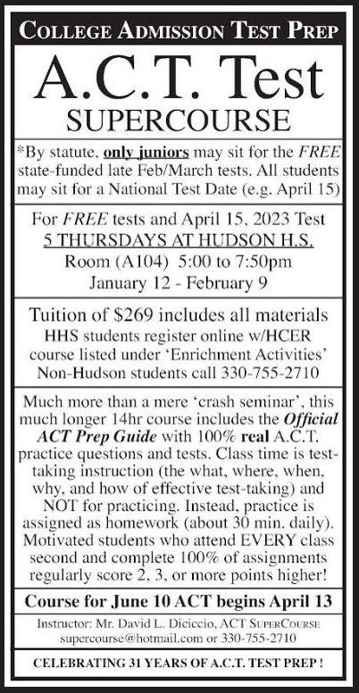 This course is much more than a mere "crash seminar" . It is a 14 hour course with the official ACT prep guide and a 100 percent real ACT practice questions. To get more information or sign up please contact: Mr. David Diciccio at 330-755-2710 or supercourse@hotmail.com.